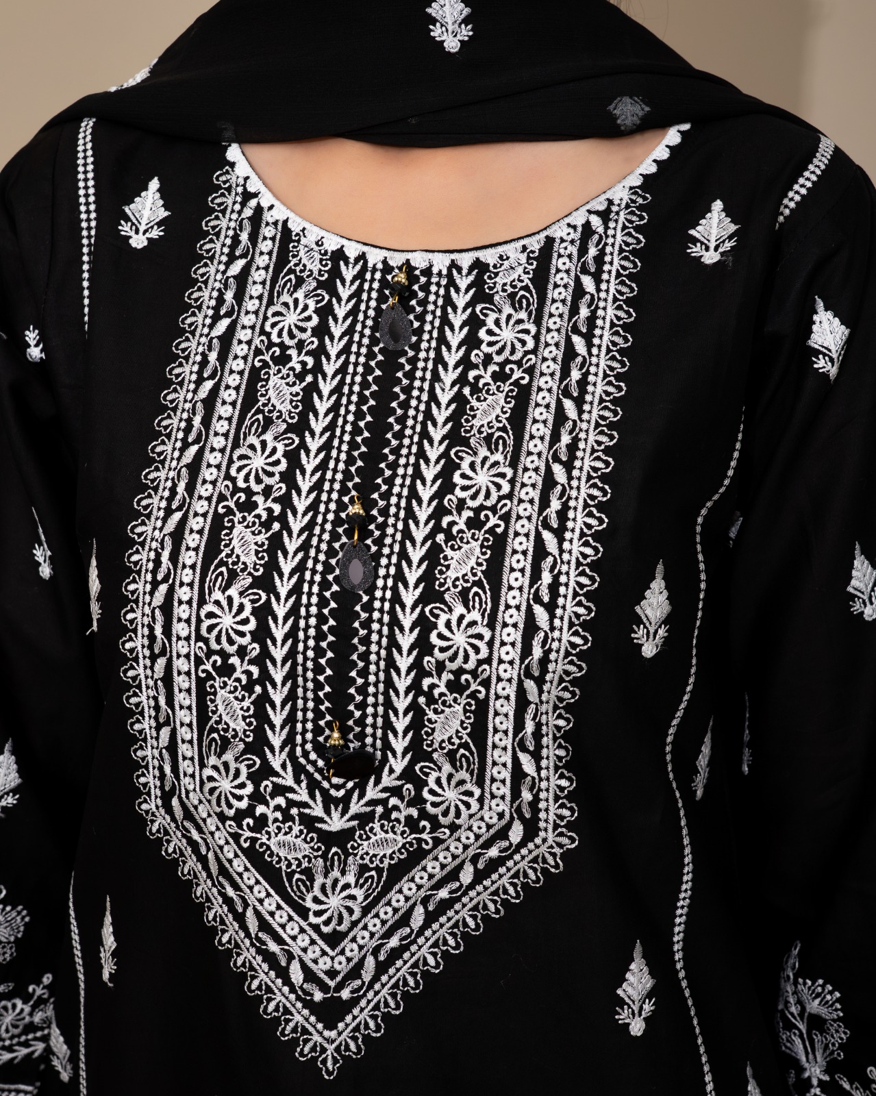 Experience timeless elegance with this beautifully crafted embroidered 3-piece outfit, designed to give you a sophisticated and graceful look for any occasion. The set features a black embroidered shirt, adorned with intricate white threadwork on the neckline, sleeves, and borders. The detailed embroidery creates a premium and classy aesthetic. The outfit is paired with a matching embroidered trouser in a soft cream shade, featuring delicate border embroidery for a complete, coordinated look. The ensemble is complemented by an embroidered dupatta, adding that final touch of elegance and finesse.