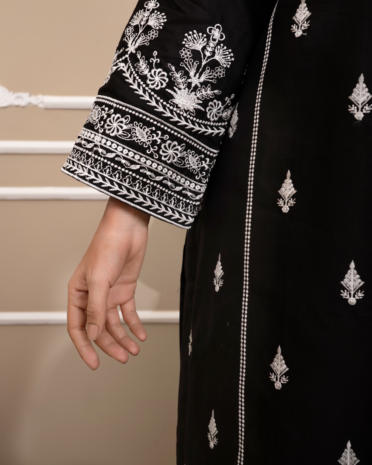 Rich white embroidery on a deep black base for a bold and refined look.
